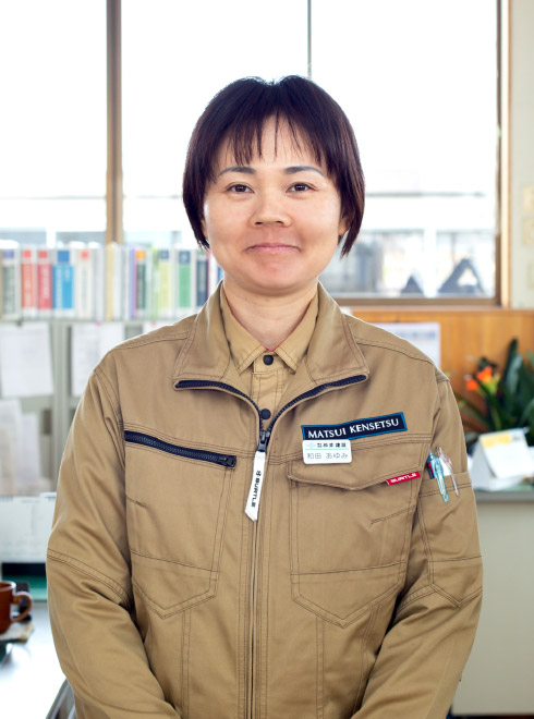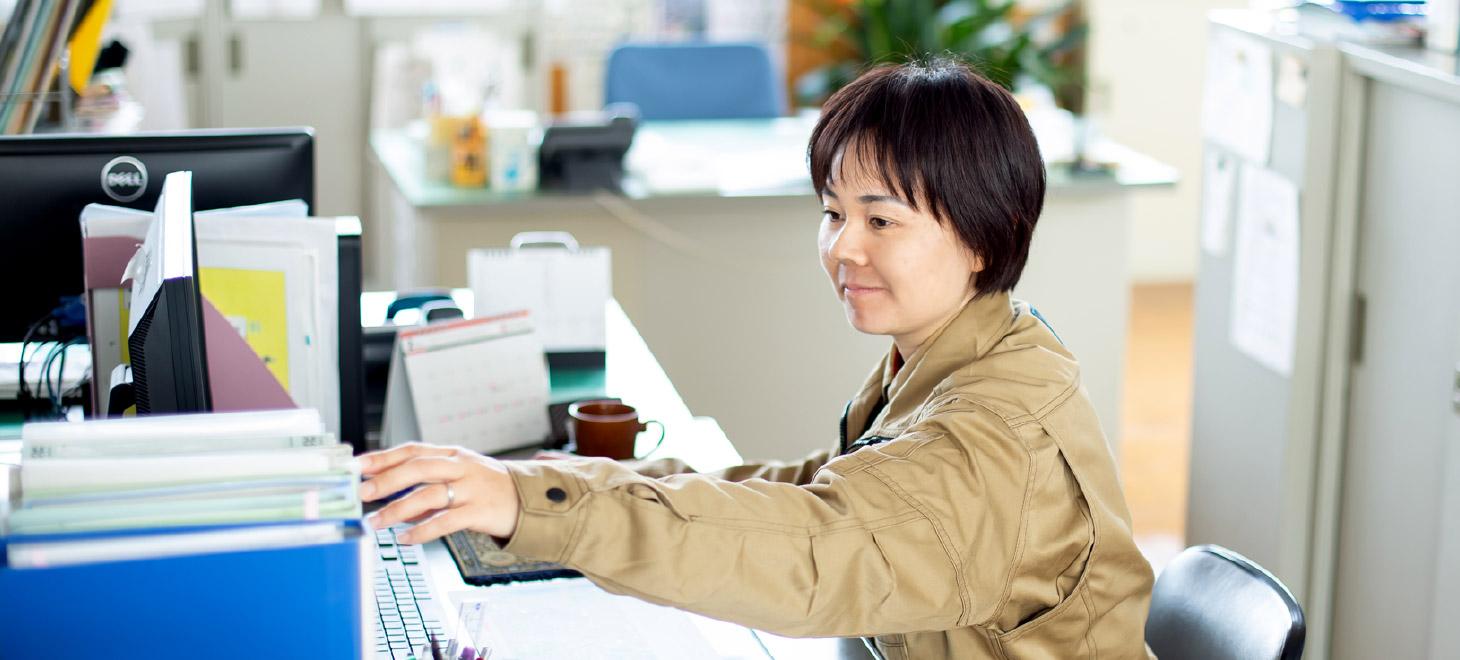 子育て中のため「家から近い」といった理由で松井建設に就職しました。主な仕事は土木工事等に必要な書類の作成。土木関係の仕事は未経験だったので、普段は使わないPCソフトや、聞いたことのない用語を覚えるまでは大変でした。