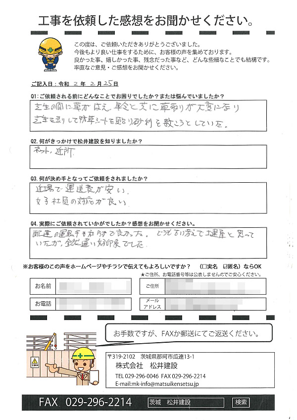 - 時間通りの配達、かつ砕石の質と量も十分であり、知人にも紹介したいと思った。