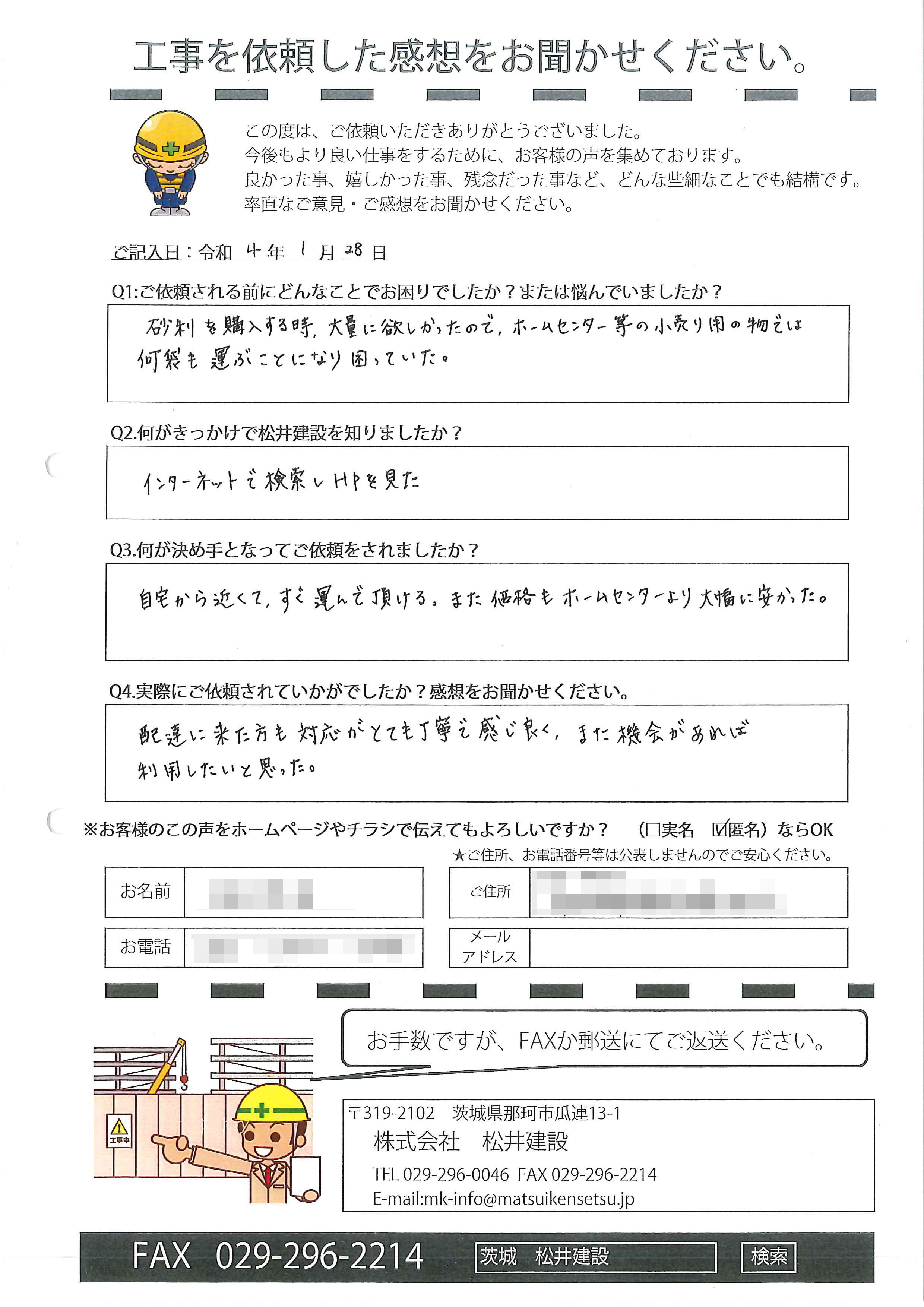 この度はアンケートご回答ありがとうございました。DIYのご相談。砕石のご注文でした。