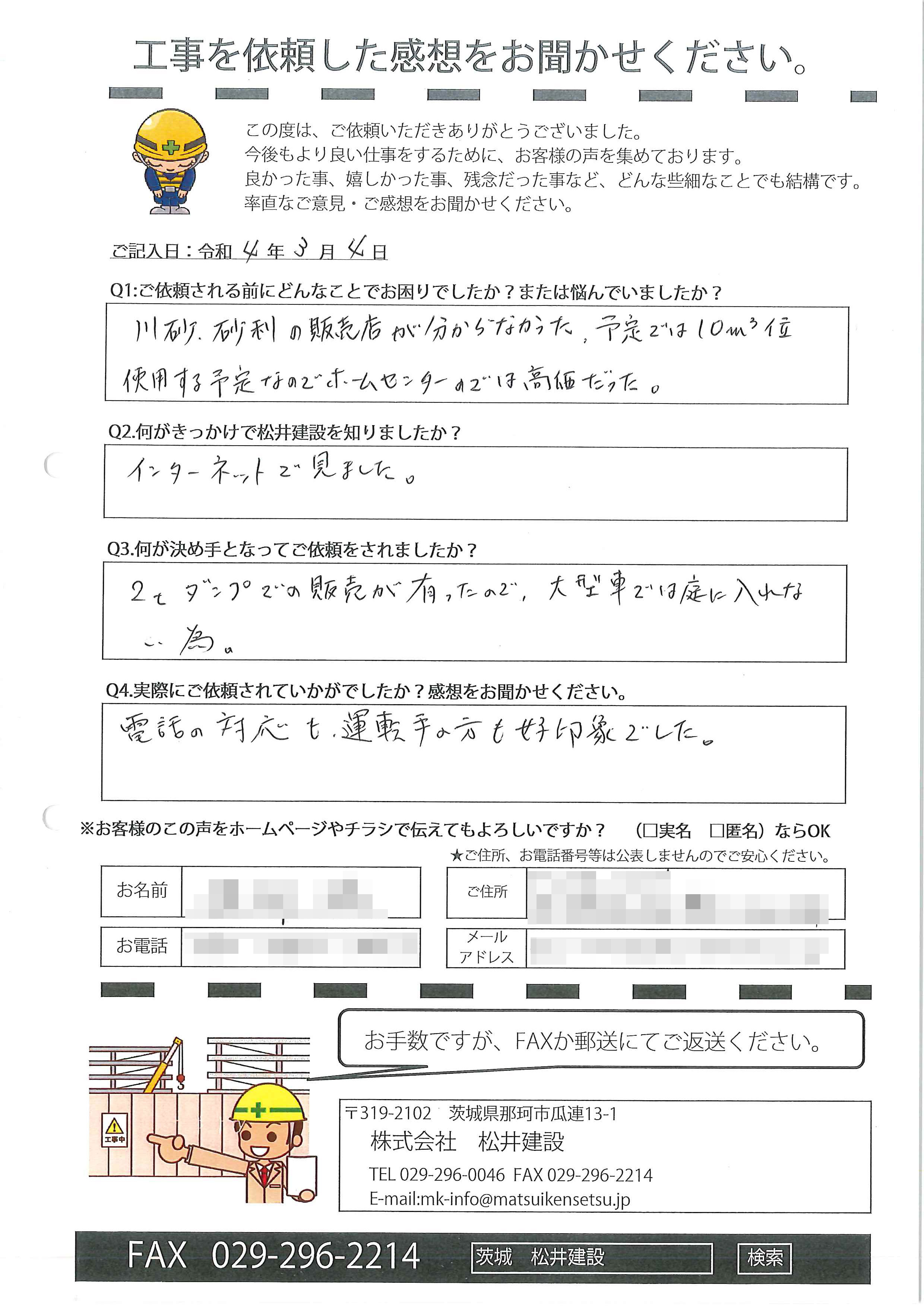 - 時間通りの配達、かつ砕石の質と量も十分であり、知人にも紹介したいと思った。